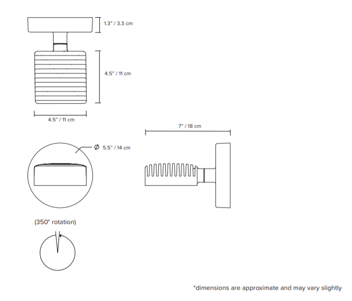 - 사양 : LED 램프 제공 (내장형) 전력 소비 : 5W 루멘 출력 : 3000K - 402 lm 색온도 :3000K (dim to warm 3000k to 2200k) 2700K (dim to warm 2700k to 2200k) 연색성 지수 : ≥90 CRI 표준 예상 수명 : 50,000 시간 이상 / 내장 디머